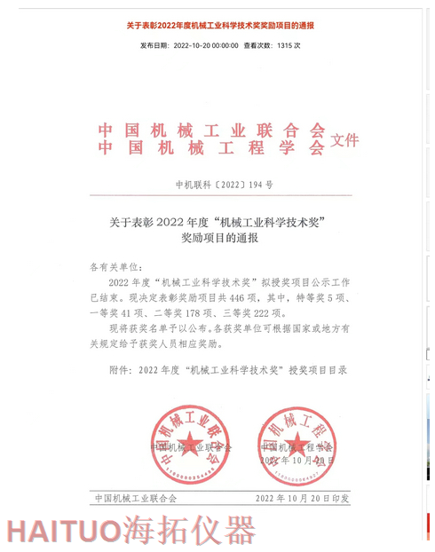 海拓儀器榮獲2022年度中國機(jī)械工業(yè)科學(xué)技術(shù)獎?ICC訊?10月20日,2022年度“中國機(jī)械工業(yè)科學(xué)技術(shù)獎”項(xiàng)目名錄正式發(fā)布,由海拓儀器(江蘇)有限公司完成的“超快速冷熱沖擊試驗(yàn)系統(tǒng)關(guān)鍵技術(shù)研究與系列應(yīng)用”項(xiàng)目榮獲2022年度“中國機(jī)械工業(yè)科學(xué)技術(shù)獎”三等獎。??據(jù)了解,中國機(jī)械工業(yè)科學(xué)技術(shù)獎是根據(jù)《國家科學(xué)技術(shù)獎勵條例》和《社會力量設(shè)立科學(xué)技術(shù)獎管理辦法》的有關(guān)規(guī)定,由中國機(jī)械工業(yè)聯(lián)合會和中國機(jī)械工程學(xué)會共同設(shè)立并經(jīng)國家科學(xué)技術(shù)部批準(zhǔn),在國家科技獎勵主管部門登記的面向全國機(jī)械行業(yè)的綜合性科技獎項(xiàng)。旨在表彰在機(jī)械工業(yè)科技工作中作出突出貢獻(xiàn)的單位和人員,獎勵范圍包括:機(jī)械工業(yè)科學(xué)技術(shù)發(fā)明成果、機(jī)械工業(yè)科學(xué)技術(shù)進(jìn)步成果、機(jī)械工業(yè)工程化和新技術(shù)推廣成果和機(jī)械工業(yè)軟科學(xué)和標(biāo)準(zhǔn)成果。??海拓儀器是一家集研發(fā)、制造、貿(mào)易于一體高科技現(xiàn)代化公司,公司成立于2005年,主要產(chǎn)品包括:超快速冷熱沖擊試驗(yàn)機(jī)(熱流儀)、快速溫變應(yīng)力篩選試驗(yàn)箱(ESS),